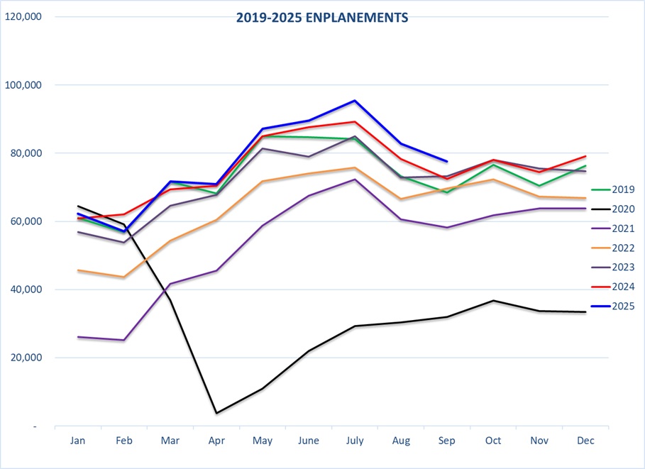 In September, Wichita Eisenhower National Airport set a new record with 77,628 passengers boarding flights—the highest number ever recorded for the month. This marks the seventh consecutive month of record-breaking traffic. Total passenger counts reached 157,303, up 7.47% from last September, with enplanements increasing 7%. Year-to-date, total passenger numbers are up 2.98%.