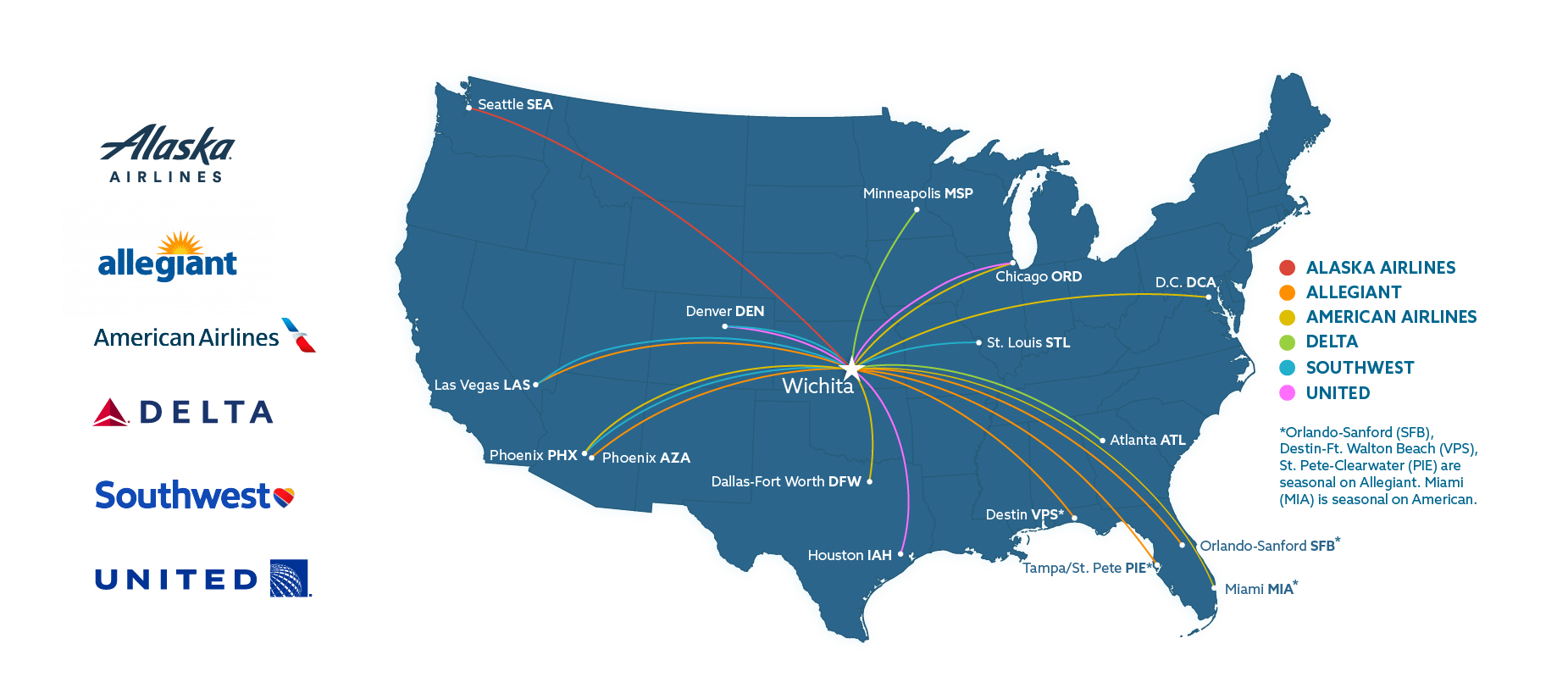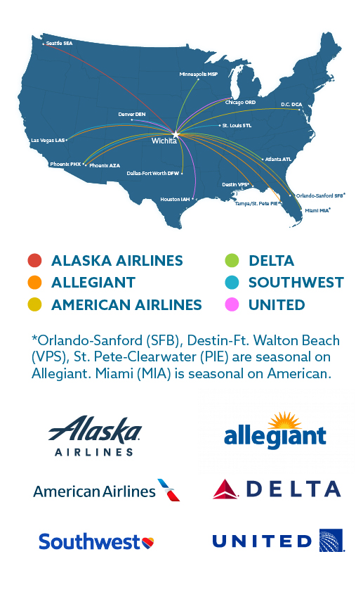 From Wichita, your next getaway is just one flight away! With 16 nonstop destinations, you can catch a ballgame in Chicago, explore the desert in Phoenix, or hit the beach in Florida for the ultimate family vacation. Ready to go? Check out the latest fare deals from our airlines at the links below. Wherever you’re headed, you can start your journey from ICT.